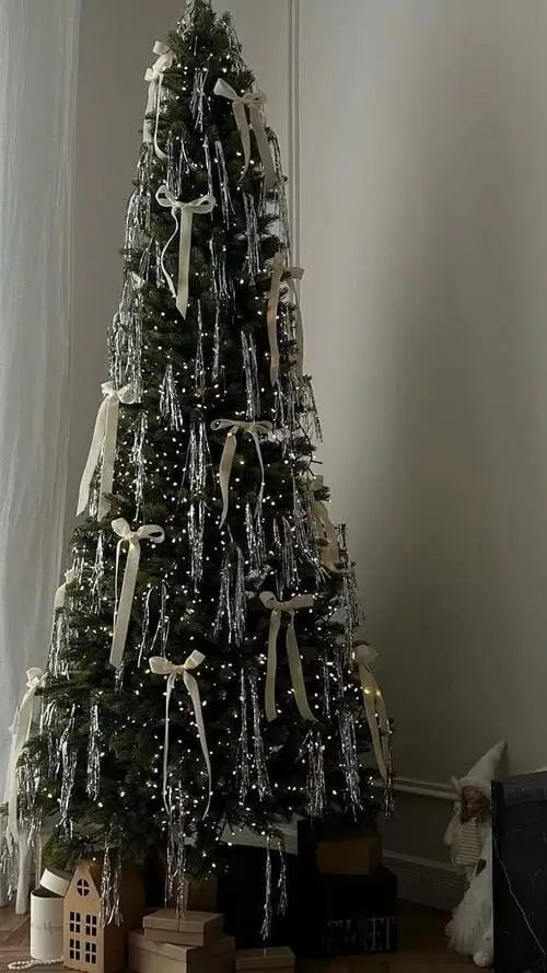 A tinsel and bow Christmas tree gives you all the vintage holiday feels while still looking super chic in 2025.
