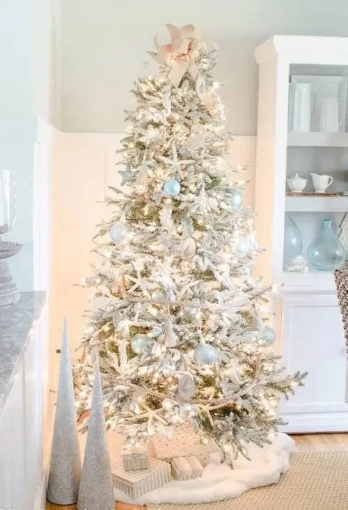 Think frosted branches, seashells, starfish, and ornaments in seafoam blue and pearly white.