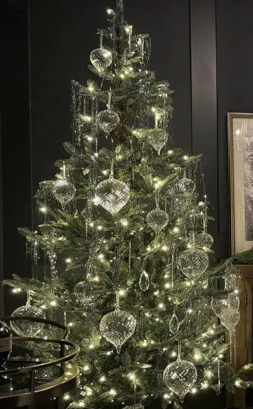 The effect is dramatic, luxe, and absolutely breathtaking – the kind of Christmas tree theme that makes your whole living room sparkle like a snow palace.