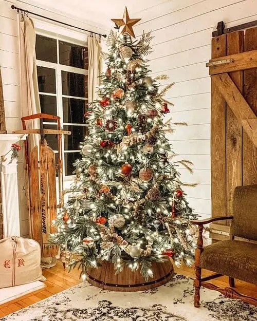 Mixing natural textures with metallic accents makes the tree stylish yet down-to-earth, and it pairs beautifully with farmhouse staples like shiplap walls, woven baskets, and vintage sleds.