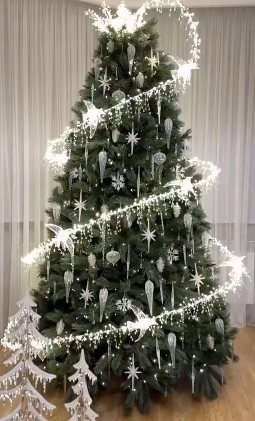 For a timeless winter wonderland look, you can’t go wrong with an all white Christmas tree theme.